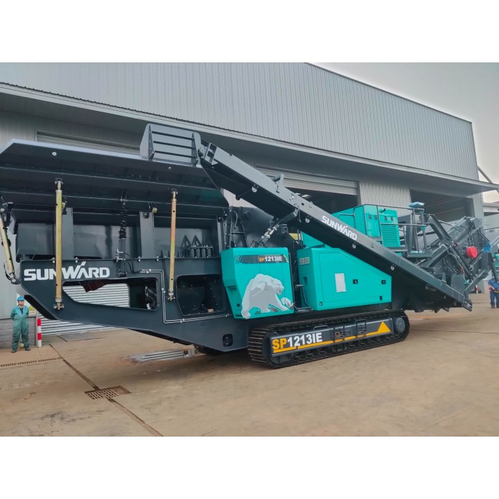 Основным элементом гусеничной дробильно-сортировочной установки SP1213IE является высокопроизводительная ударно – отражательная дробилка с горизонтальным валом SPG1213I, которая применяется на первой стадии дробления малоабразивного материала (известняк, доломит, уголь), а так же при переработке строительных отходов. Подача материала в дробилку осуществляется вибрационным колосниковым питателем с функциями предварительного отсева мелкой фракции, которая разгружается боковым конвейером. Установка оснащается грохотом в двух вариантах: однодечным – для направления крупного материала возвратным конвейером на додрабливание и двухдечным для направления материала на додрабливание и дополнительного отсева фракции требуемого размера.